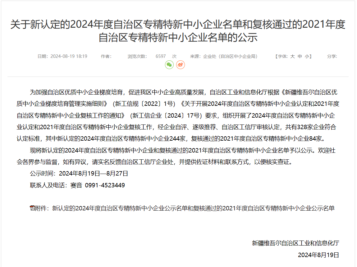 自治區(qū)工業(yè)和信息化廳根據(jù)《新疆維吾爾自治區(qū)優(yōu)質(zhì)中小企業(yè)梯度培育管理實(shí)施細(xì)則》(新工信規(guī)〔2022〕1號(hào))《關(guān)于開展2024年度自治區(qū)專精特新中小企業(yè)認(rèn)定和2021年度自治區(qū)專精特新中小企業(yè)復(fù)核工作的通知》(新工信企業(yè)〔2024〕17號(hào))要求,經(jīng)企業(yè)自評(píng)、逐級(jí)推薦、自治區(qū)工信廳審核認(rèn)定,共有328家企業(yè)符合認(rèn)定標(biāo)準(zhǔn),其中新認(rèn)定的2024年度自治區(qū)專精特新中小企業(yè)244家,復(fù)核通過的2021年度自治區(qū)專精特新中小企業(yè)84家。恒升醫(yī)學(xué)位列其中。